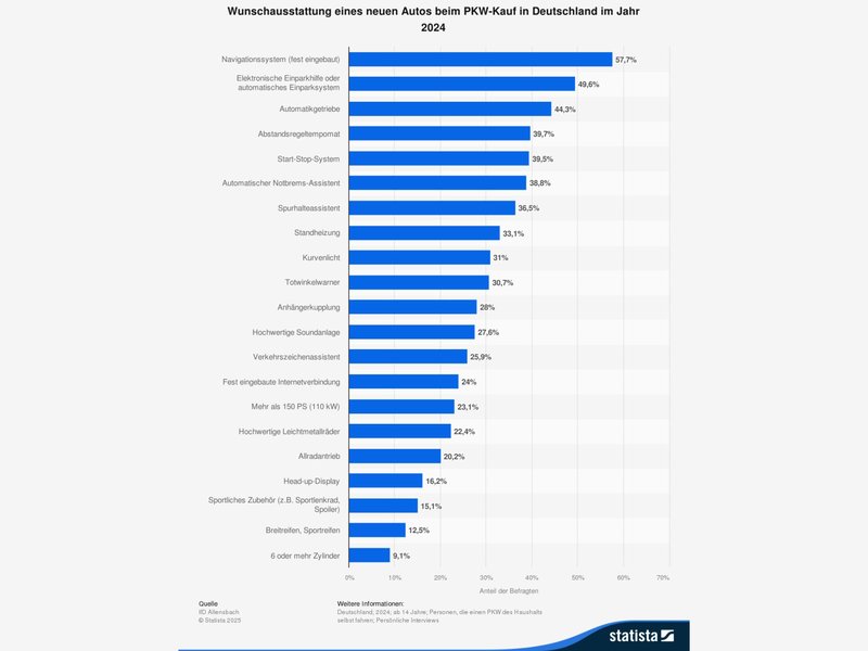 Die Wünsche der Autofahrer ändern sich stetig – doch im aktuellen Mobilitätsmonitor 2024 des IfD Allensbach zeichnen sich klare Präferenzen ab. Welche Ausstattungsmerkmale dominieren? Welche Technologien fristen ein Nischendasein? Wir liefern euch die wichtigsten Daten und liefern den Kontext dazu.